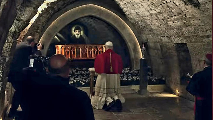 أمام ضريح مار شربل في دير مار مارون- عنّايا، جثا البابا على المركع صلاته بصمت، وأضاء بعدها شمعة على أنغام التّراتيل الدّينيّة.