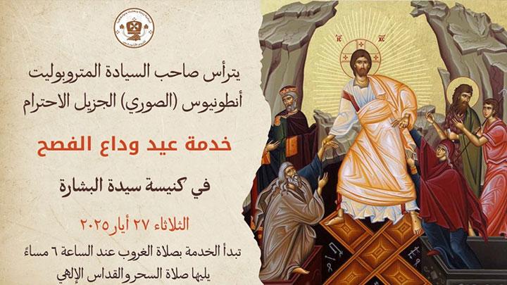 يترأّس متروبوليت أبرشيّة زحلة وبعلبك وتوابعهما للرّوم الأرثوذكس أنطونيوس الصّوريّ خدمة وداع الفصح مساءً، في كنيسة سيّدة البشارة.