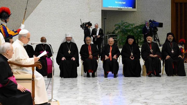 الكنيسة بحاجة إليكم. إنَّه إسهام كبير، الإسهام الّذي يمكن أن يقدّمه لنا اليوم الشّرق المسيحيّ! ونحن نحتاج إلى أن نستعيد معنى سرّ الخدمة، الحاضر بعمق في طقوسكم، الّتي تشمل الإنسان كاملة، وتنشد جمال الخلاص، وتوقظ الدّهشة أمام عظمة الله الّتي تعانق صِغَر الإنسان! وكم هو ضروريّ أن نكتشف من جديد، حتّى في الغرب المسيحيّ، معنى أولويّة الله، وأهمّيّة “أسرار الإيمان والطّقوس المقدّسة”، وقيمة الشّفاعة المستمرّة، والتّوبة، والصّوم، والبكاء على خطايانا وخطايا العالم أجمع(πένθος – الألم الداخليّ)، وهي عناصر مميّزة في الرّوحانيّات الشّرقيّة! لهذا، من الضّروريّ أن تحافظوا على تقاليدكم دون أيّ تبديل أو تخفيف فيها، لأسباب عمليّة أو لتسهيل الصّلاة، لئلّا تُفسدها روح الاستهلاك والنّفعيّة.
