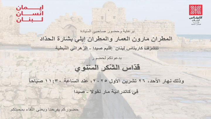 يرفع إقليم كاريتاس صيدا- الزّهراني النّبطيّة الشّكر لله في القدّاس السّنويّ، برعاية وحضور المطرانين مارون العمّار وإيلي بشارة الحدّاد.