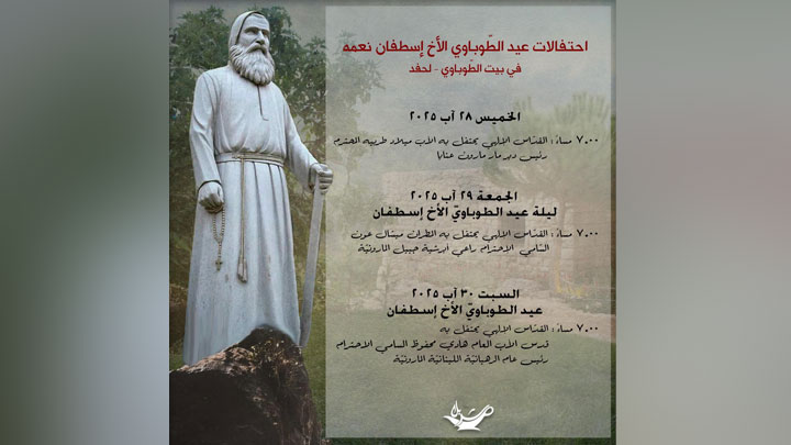 يحتفل بيت الطّوباويّ الأخ إسطفان نعمه في لحفد بعيد أيّام الخميس والجمعة والسّبت، وفقًا للتّالي: