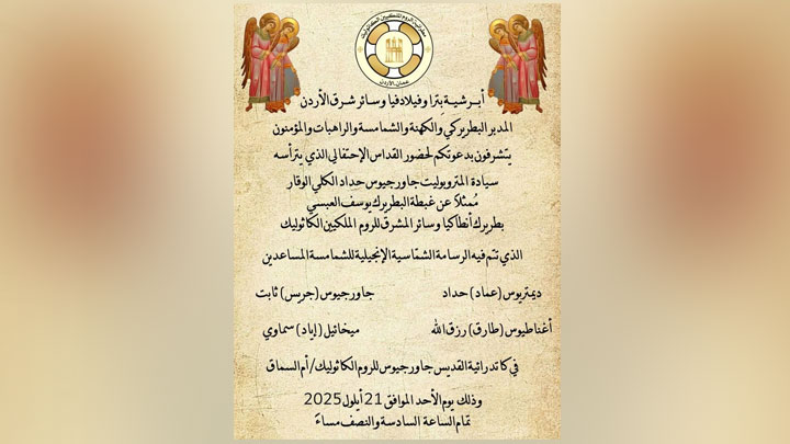 تحتفل أبرشيّة بترا وفيلادلفيا وسائر شرق الأردنّ، بالرّسامة الشّمّاسيّة الإنجيليّة للشّمامسة: ديمتريوس عماد حدّاد، جاورجيوس جريس ثاتب، أغناطيوس طارق رزق الله وميخائيل إياد سماوي.