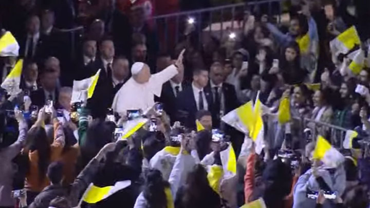 البابا وفي سيّارة الباباموبيلي دخل الصّرح على وقع هتافات الشّبيبة الآتية من كلّ مكان في لبنان، ومن بلدان الشّرق، كما من بلدان الاغتراب، فتخظّى عددهم الـ12 ألف، حيّاهم متوجّهًا نحو المنصّة الرّئيسيّة لتنطلق الفعاليّات الّتي ستتضمّن بعدالاستقبال، وصول البابا إلى المنصّة الرّسميّة، الّذي سيصعد مع الشّبيبة إلى الكرسيّ المخصّص له، ويتلو الصّلاة الافتتاحيّة.
