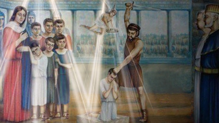 هي القدّيسة شموني وأولادها الشّهداء السّبعة: أفيموس وأنطونيوس وغورياس وأليعازر وأوسيبونوس وعليموس ومركلّوس، المعروفين بالشّهداء “المكابيّين” الّذين قُتلوا في أنطاكية على أيّام الملك أنطيوخوس أبيفانيوس لأنّهم لم ينكروا الله الحقيقيّ، حوالي سنة 160 ق.م، والّذين تحتفل الكنيسة اليوم بذكرى استشهادهم؛ فنتوقّف أمام شجاعتهم وبسالتهم، وأمام صبر أمّ طوباويّة ما استسلمت لضعفها البشريّ حتّى آخر نفس أطلقته.