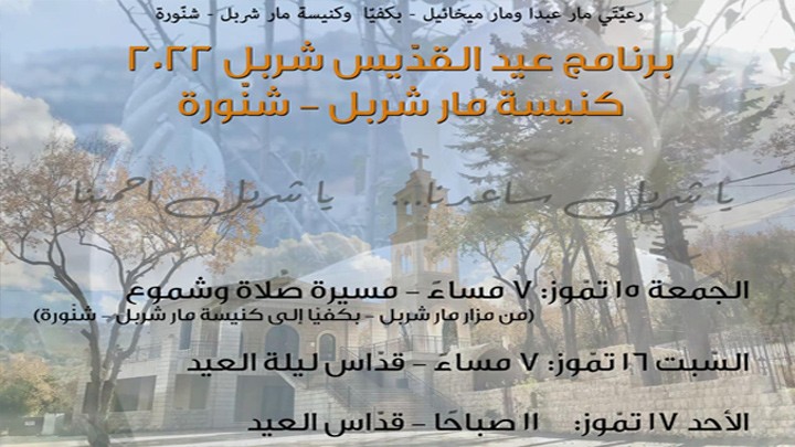 تحتفل رعيّتا مار عبدا ومار ميخائيل- بكفيّا وكنيسة مار شربل- شنّورة بعيد القدّيس شربل، في كنيسة مار شربل- شنّورة، أيّام الجمعة والسّبت والأحد، وفقًا للتّالي: