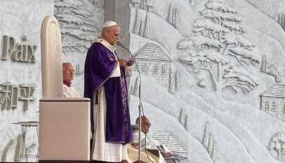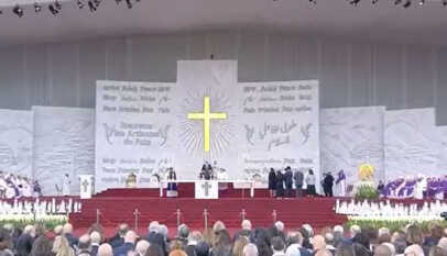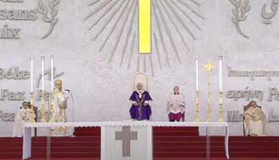 تيلي لوميار/ نورسات بعد أن أقلّته الباباموبيلي إلى المذبح ليحتفل بالقدّاس الإلهيّ الحبريّ في …