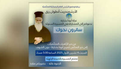 تيلي لوميار/ نورسات تقيم “عيلة أبونا بشارة”، برعاية الرّئيس العامّ للرّهبانيّة المخلّصيّة الأرشمندريت أنطوان رزق وحضوره، المسيرة السّنويّة تحت عنوان “سائرون نحوك”، وذلك يوم غد السّبت عند الخامسة مساءً. يتطلق المسيرة من دير الرّاهبات المخلّصيّات إلى دير المخلّص حيث ضريح الأب بشارة أبو مراد- جون الشّوف. وتُختتم بالذّبيحة الإلهيّة.