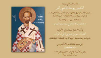 تيلي لوميار/ نورسات بمناسبة عيد القدّيس يوحنّا الذّهبيّ الفمّ، يحتفل المجلس الرّاعويّ وكهنة رعيّته في مطرانيّة بيروت للرّوم الكاثوليك- طريق الشّامّ، بعد غد الأربعاء، بصلاة الغروب الاحتفاليّة مع رتبة تبريك الخبزات، عند السّادسة مساءً. يترأّس الاحتفال متروبوليت بيروت وجبيل وتوابعها للرّوم الملكيّين الكاثوليك المطران جورج بقعوني، يمنح خلاله الأب أندره…