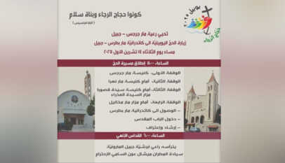 تيلي لوميار/ نورسات تحيي رعيّة مار جرجرس- جبيل، بعد قليل، زيارة الحجّ اليوبيليّة إلى كاتدرائيّة مار بطرس- جبيل،. تنطلق مسيرة الحجّ عند الخامسة مساءً، وتتخلّلها المحطّات التّالية: – الوقفة الأولى: كنيسة مار جرجس – الوقفة الثّانية: أمام كنيسة مار نهرا – المحطّة الثّالثة: أمام كنيسة سيّدة قصوبا مزار السّيّدة العذراء…