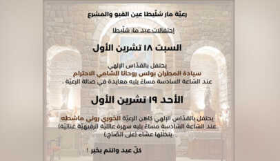تيلي لوميار/ نورسات في إطار احتفالات عيد مار شليّطا في رعيّته بعين القبو والمشرع، يترأّس النّائب البطريركيّ على نيابة صربا المارونيّة المطران بولس روحانا، يوم السّبت، القدّاس الإلهيّ عند السّادسة مساءً، يليه معايدة في صالة الرّعيّة. كما يحتفل كاهن الرّعيّة الخوري روني ماشطه، يوم الأحد، بالقدّاس عند السّادسة مساءً، يليه…